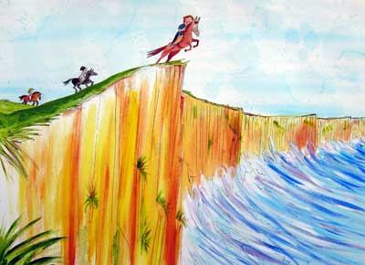 “Madam. I don’t advise,” said the instructor – but she began to canter and then to gallop. She called out, “Come, Scardey-cat.” So Bertie kicked his horse, in a nice way, to say, “go,” to the Arabian horse. Boy did he go! He shot past the stepmother and her black pony and sped on like an arrow to the edge of the cliffs. Bertie pulled in the reigns saying, “Whoa, Whooooa,” but the pony would not stop. He galloped right up to the edge – and beyond!