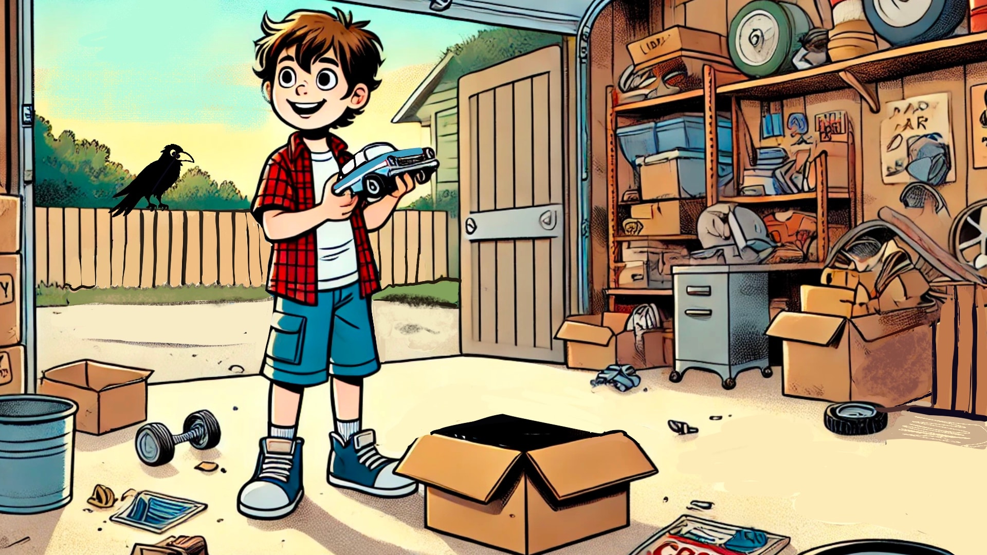 Digging deeper into the box, his fingers closed around something solid and metallic. He pulled out a detailed toy car, its paint slightly chipped but still gleaming.