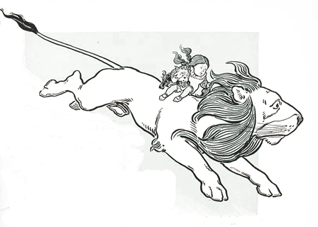“I am terribly afraid of falling, myself,” said the Cowardly Lion, “but I suppose there is nothing to do but try it. So get on my back and we will make the attempt.”