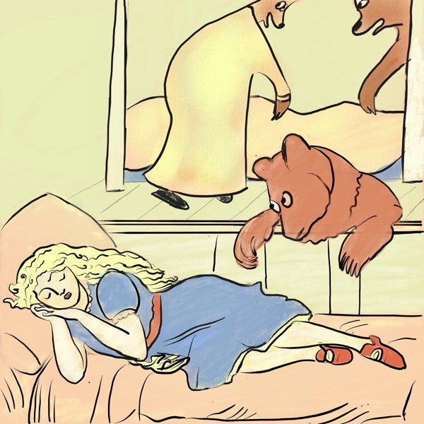 “Somebody has been lying in my bed, and here she is!” Said the little, small wee bear, in his little, small wee voice.