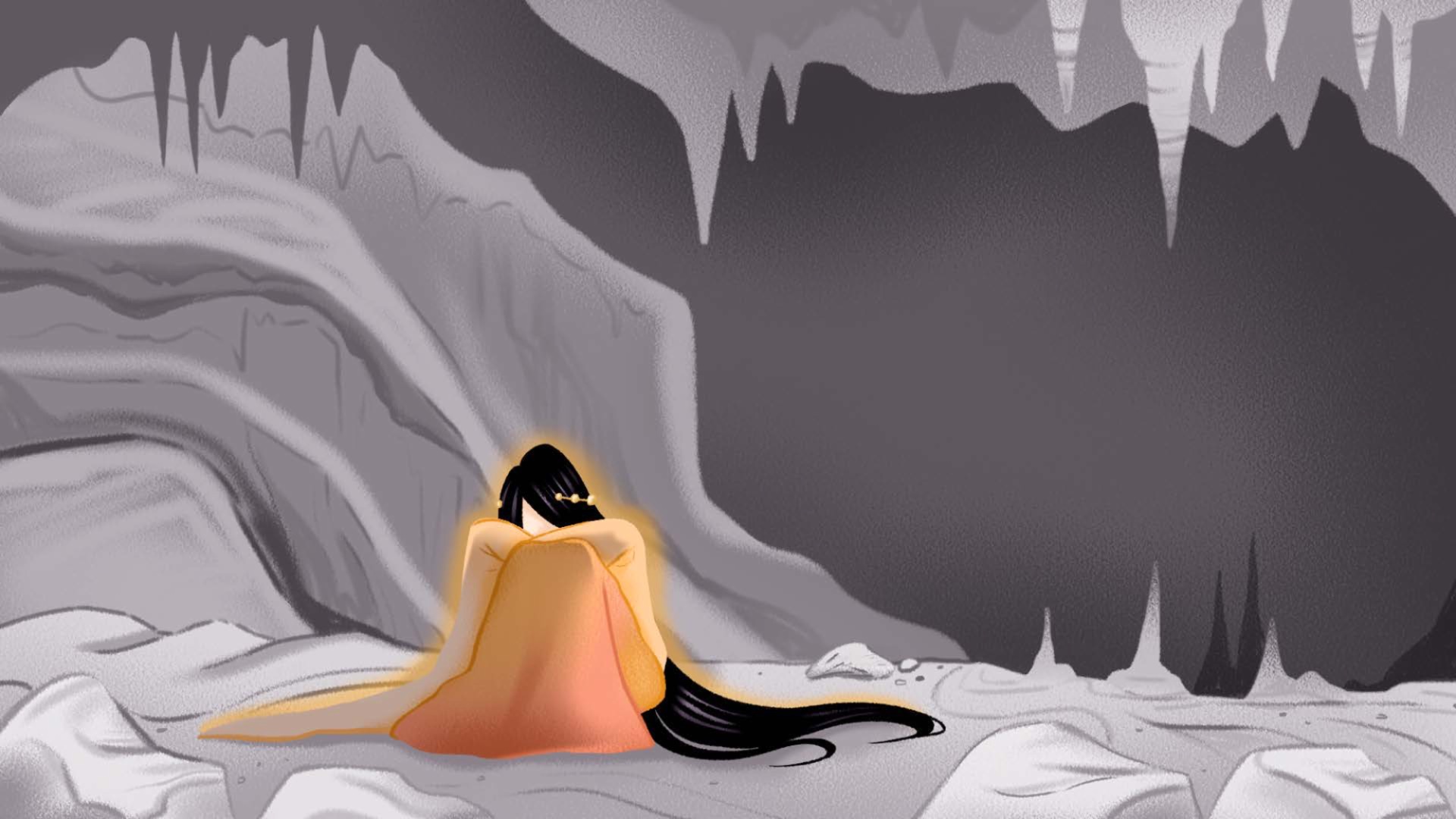 The bright goddess was greatly offended by the evil pranks of her brother. She fell into a most dreadful sulk, and hid herself in a cave in a remote part of the earth. There was no more light, and heaven and earth were plunged into darkness.