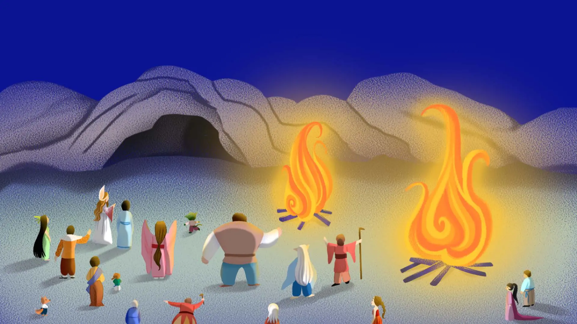 When they were ready, the divine ones gathered outside the cave of the Sun Goddess. They lit bonfires so that they could see in the darkness, and they called the goddess by her name, Amaterasu, but no matter how many times they called, she remained lurking within the shadows of her hiding place.